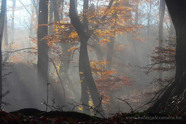 Ezúttal beveszem az egyébként jól jelzett kanyart, és pár lépés után elámulva megállok: a Vörös-hegyi árok mélyén ott mocorog kéken, mint valami élőlény, egy kis ködfelhő. Erre vártam! Örömmel elmerülök a szárazvölgyben, lábam alatt besüpped a száraz, bronzbarna bükkavar. Minden lépés egy újabb csoda! Előttem még napsütés lobbantja lángra a narancsos színeket, két lépés múlva kék homály simogatja visszafogottra a színeket. Délceg, szürke bükkfatörzsek viselik az őszi lombszínekbe öltözött koronát. Amikor visszanézek, a fény glóriát és sugarakat von a fák törzse köré... pompás látvány!